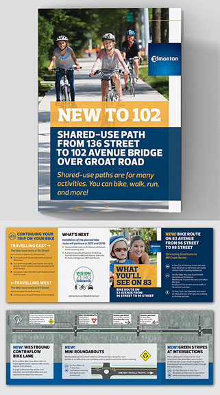As part of the City of Edmonton’s program to encourage people of all ages to try new ways to get around in their communities and in the city, new shared use, bike lanes, and paths were installed. A series of brochures were created to introduce some of the new movement patterns and routes, and included detailed maps to help bike and vehicle users learn how to navigate the routes.