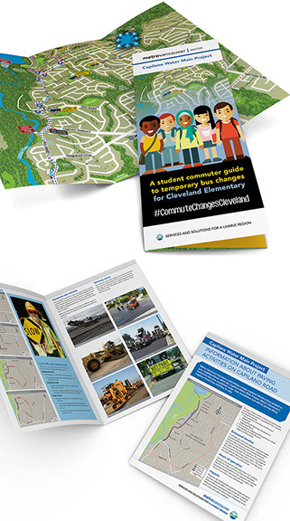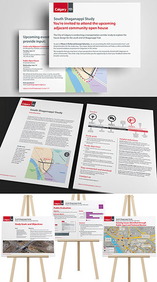 Various pieces were designed and created for this engagement campaign to seek feedback from the community about the transportation study’s short- and long-term recommended plans. This included advertisements, postcards, signage, handouts, feedback forms, map work and other infographics, and a detailed set of display panels, most of which were produced on a tight deadline.