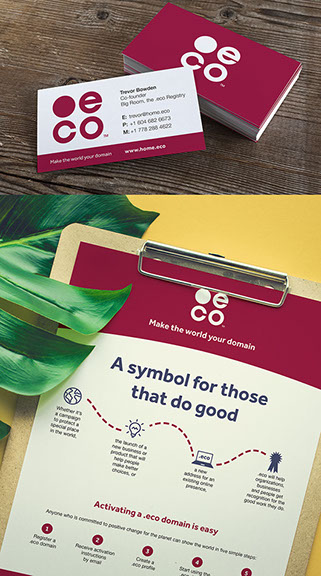 Working with the registry for .eco domain, I produced a variety of branded marketing materials for the initial rollout and introduction for the new top-level domain. Materials included business cards, postcards, information sheet, brochure, roll-up banner display, and sticker.
