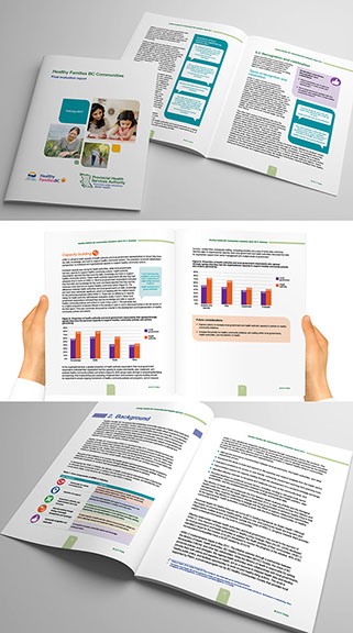 Working for the Provincial Health Services Authority, two reports were produced (a full evaluation report as well as a summary). Without veering from their established brand guidelines for the typography, colour palette, and layout, project branding was designed to help identify specific sections of the report and to carry through a consistent colour theme to identify the categories in the infographics.
