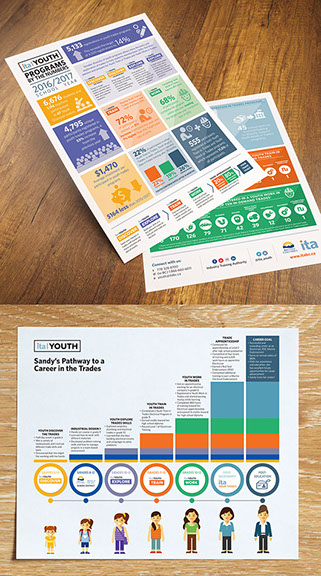 These one- and two-page handouts summarize some of the key information about the recently-updated ITA Youth Train in Trades and Youth Work in Trades Programs. This included creating infographics to give a snapshot of the results for the year, provide an at-a-glance overview of the youth programs, and give information to educators, students and their families, and industry stakeholders.