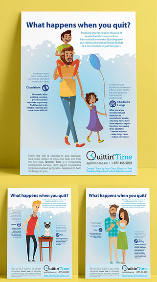 As part of an information package for provincial employees to educate about the health and wellness programs available to them, the Quittin’ Time posters were designed to appeal to a variety of demographic types. These posters highlighted some of the dangers of smoking as well as the benefits of quitting smoking.