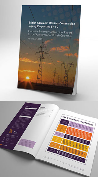 This project included the design and layout for a 20-page Executive Summary as a companion to the Site C Inquiry Full Report, as presented to the Government of British Columbia to determine the financial impact of continuing, suspending, or terminating BC Hydro’s Site C dam project. Working under tight deadlines, the work included creating several infographics to help give a clear summary of the inquiry results, as well as a press release handout that highlighted the key findings.