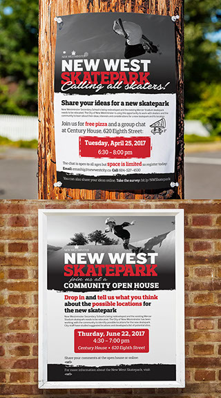 Working with Ideaspace, a program identity was designed for the planning, design, and relocation of a skatepark in the City of New Westminster. Program materials were designed for a variety of audiences, including the general community as well as skaters who currently use the existing skatepark.